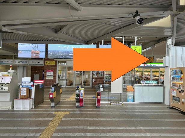近鉄賢島駅改札(一ヶ所のみ)を出たら、右にお進みください。