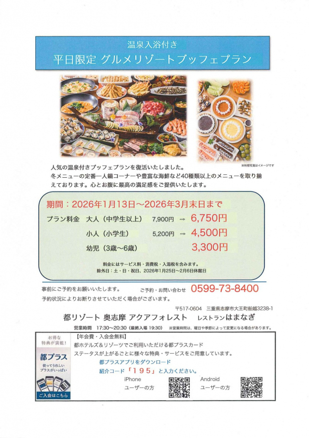 温泉入浴付き平日限定グルメリゾートブッフェプラン(予約制)