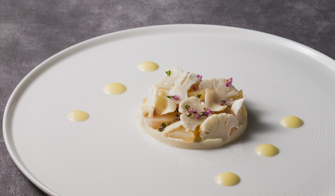 カリフラワーとゆり根の異なる食感が楽しい『鯛の燻製とホタテ貝柱の炙り』から始まり、