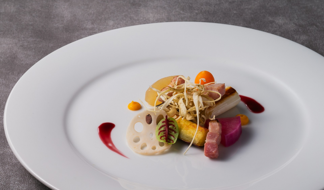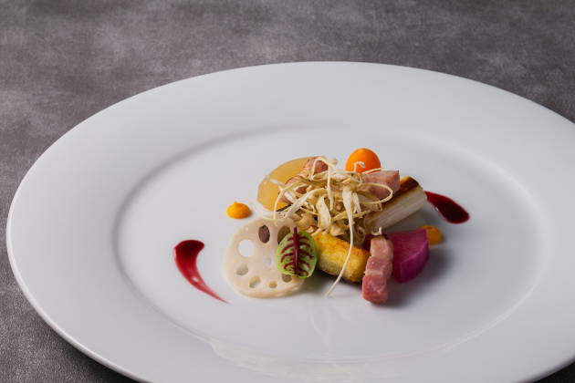 魚料理と肉料理のダブルメイン。ボリューム感と美しさを維持しながら、カジュアルにも楽しめるコースです。