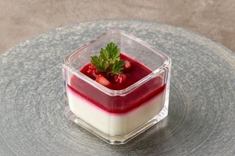 もちもちとした独特の食感が楽しい、グラス仕立てのパンナコッタです。濃厚な味わいに寄り添うのは、爽やかな酸味が広がるラズベリーソース。甘みと酸味、赤と白――それぞれのコントラストが際立つ、見た目にも華やかな一品です。