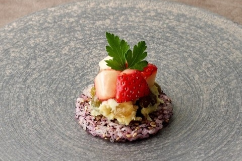 新食感の一皿!ゆかりと白ごまを混ぜ込んだ三重のブランド米「結びの神」を香ばしくカリッと焼き上げた和風ガレットに、甘納豆とクリームチーズのマッシュ、角切りいちごを重ねました。和と洋の楽しみがギュッと凝縮されたオードブルです。