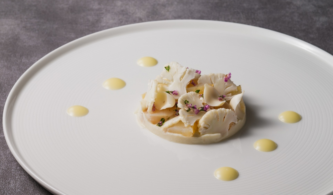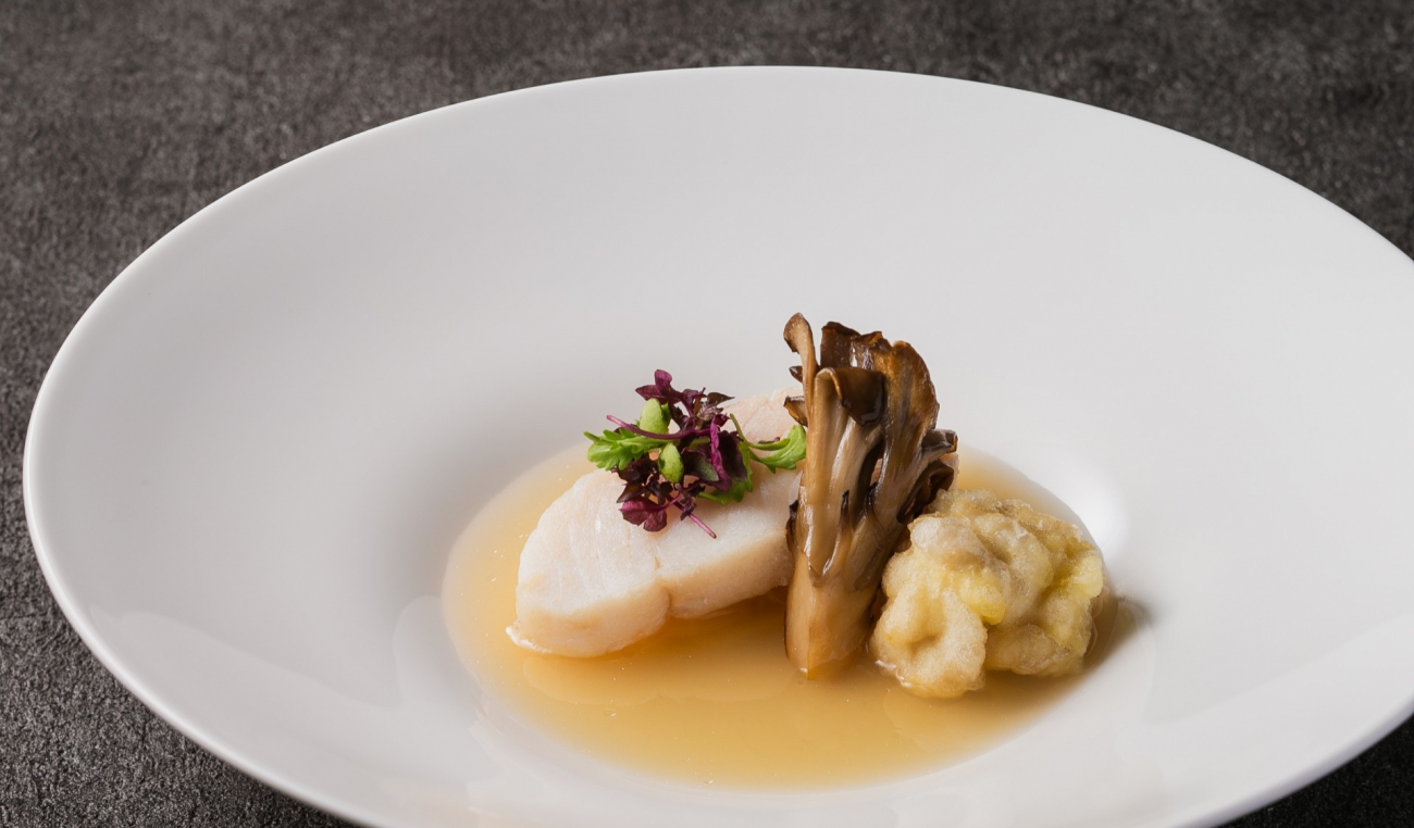 ■鯛の燻製とホタテ貝柱の炙り カリフラワーのピュレ