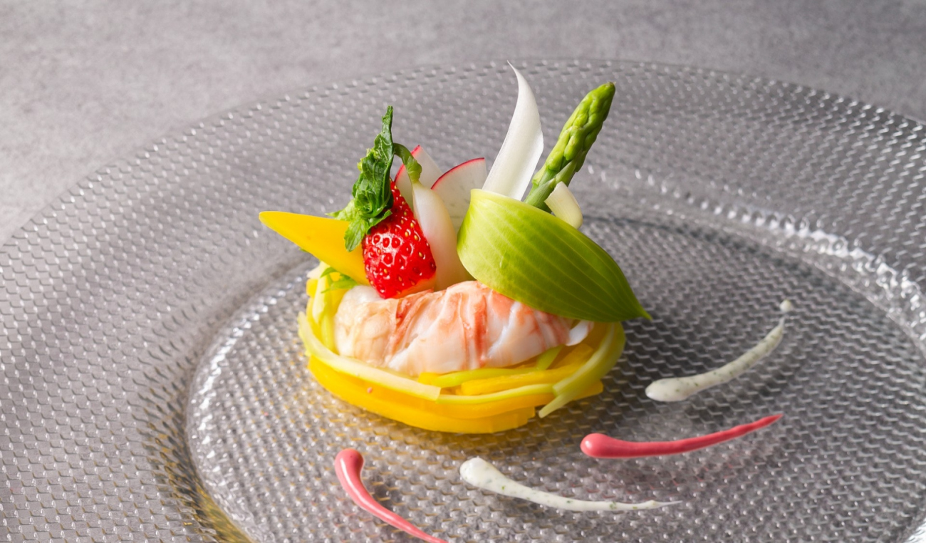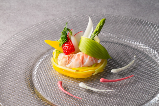 旬を迎えみずみずしさを増したアスパラガスを伊勢海老に添えてハーブのソースで味わうオードブル、
