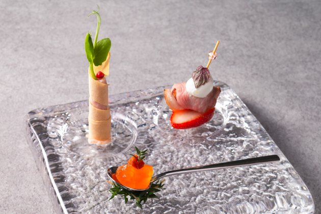 ■地養卵のマリネタイム風味・ジャンボンブランムース ペッパーの香り・苺と鴨
