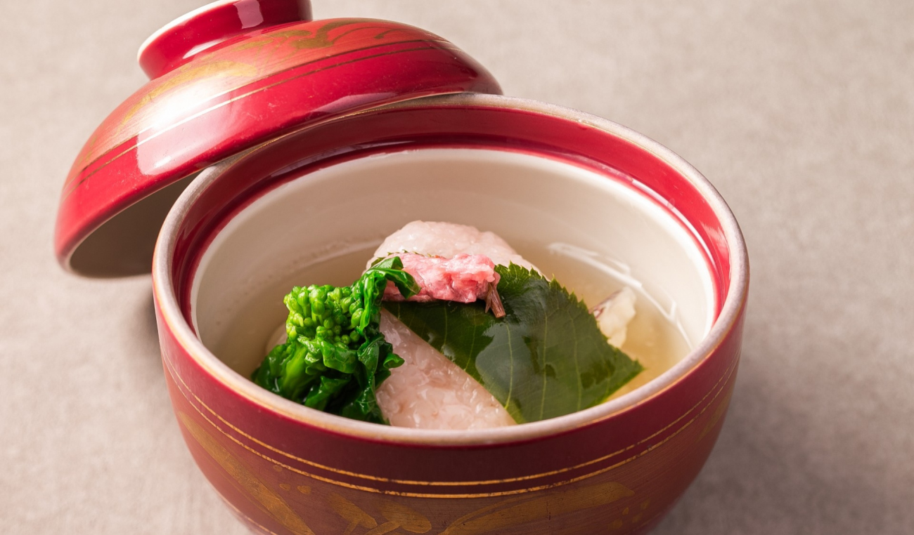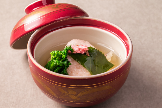 旬を迎え身のふっくらとした『はまぐり茶碗蒸し』、桜もちをイメージした蓋物『鯛の道明寺蒸し』、