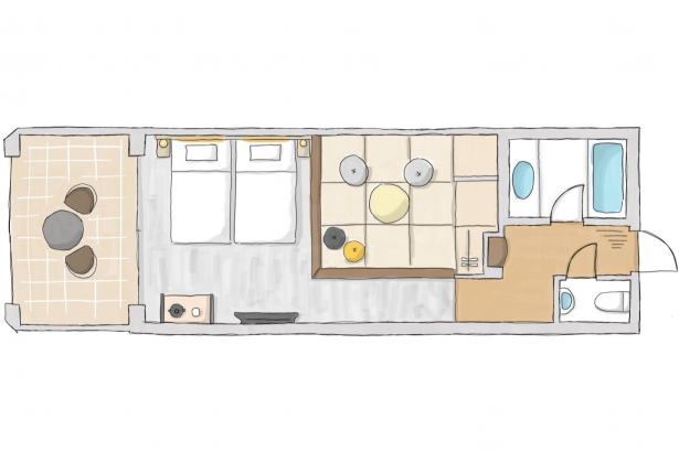 | 40.5㎡ | 最大4名 | ガーデンウィング1階&2階 | 2台 ※3~4名様の場合、デイベッドまたはエキストラベッドでのご用意となります。 |