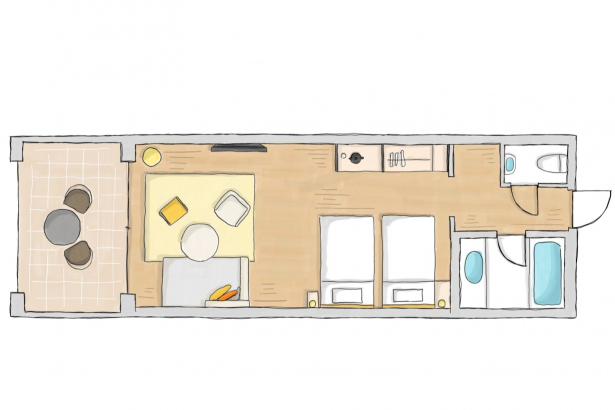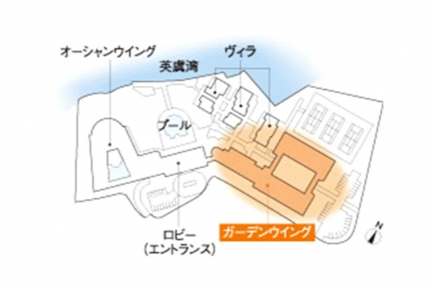 | 40.5㎡ | 最大4名 | ガーデンウィング1階&2階 | 2台 ※3~4名様の場合、デイベッドまたはエキストラベッドでのご用意となります。 |
