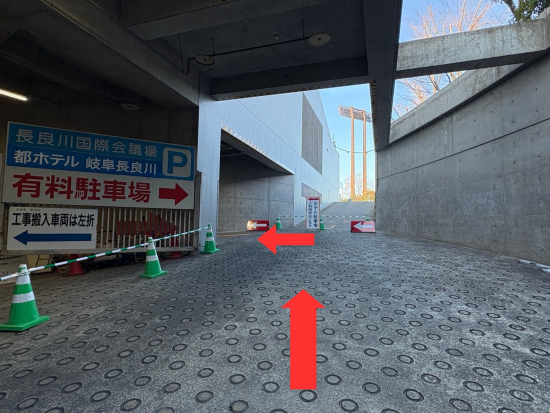 隣接する長良川国際会議場の改修工事に伴い、2026年1月21日(水)8:30~1月30日(金)14:00の期間中、地下駐車場への進入経路が一時的に変更となります。