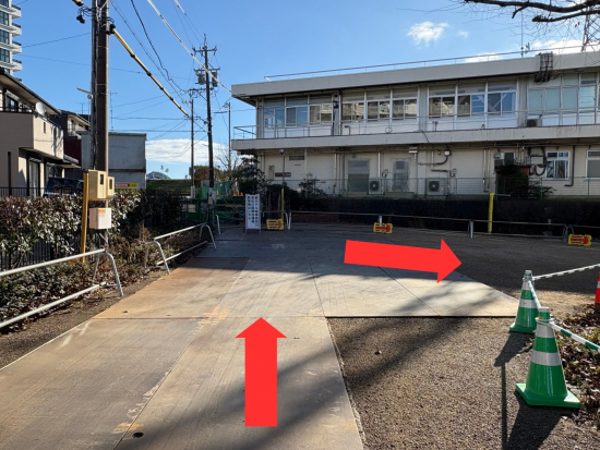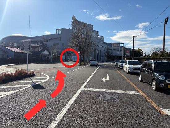 ※バスロータリーへは、奥(信号寄り)の入り口からお入りください。(画像の矢印の通りお進みください)