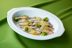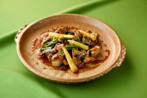 香ばしく焼き上げたサワラに、葱とホタテの旨みを凝縮したソースを添えました。