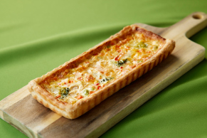 たまねぎ・えだまめ・かぼちゃ・人参・ブロッコリー・コーン・赤ピーマンを使用した、彩り豊かなキッシュ。