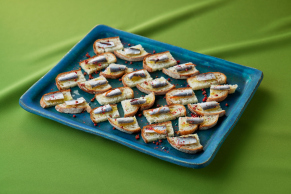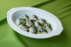 デンマーク発祥のオープンサンド。パンにオリーブオイルを塗り、魚の酢漬けをのせて仕上げました。