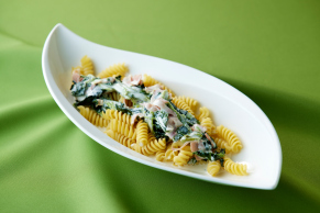 ほうれん草とベーコンを合わせ、クリームソースで仕上げたショートパスタです。