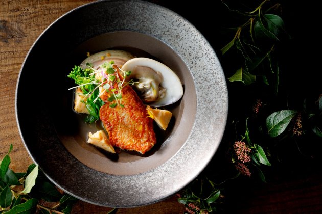 脂ののったキンキを、白川茶の香りと蛤の旨味を凝縮した澄んだエッセンスと共にお愉しみください