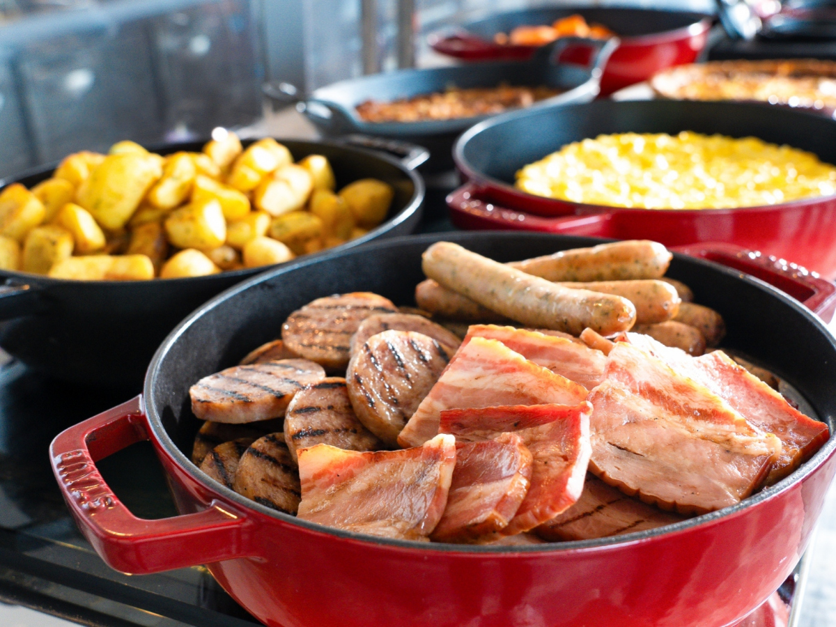 ソーセージ/スクランブルエッグ/フライドエッグ/サラダバー/日替わりスープ/スモークサーモン/モルタデッラ/パン各種
