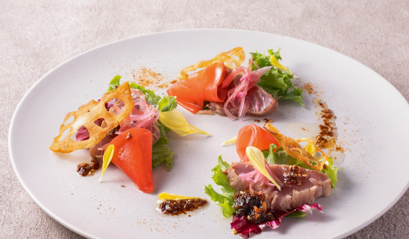 アミューズとカラフルな前菜とお召し上がりいただいたあとは、メインを【国産牛のローストビーフ】または【秋刀魚の香草パン粉焼】からお選びいただけます。