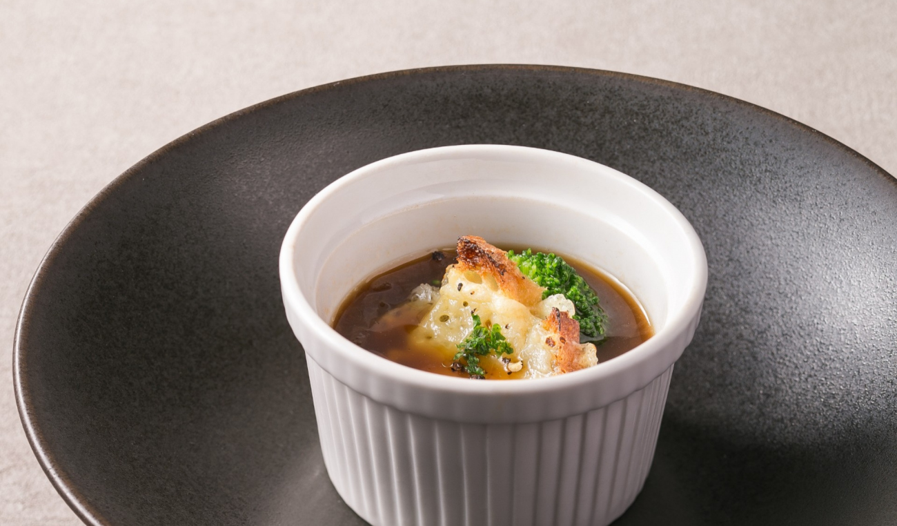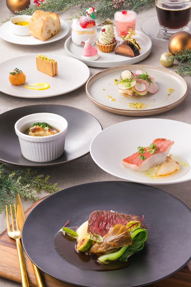 食欲をそそる香ばしさと軽やかな食感が魅力の2種のアミューズ、さっぱりとした香りの前菜、寒い冬にぴったりなオニオングラタンスープとお楽しみいただいた後は、金目鯛のバプールと牛フィレ肉のロティのWメイン、食後にはクリスマスを賑やかに彩る5種のスイーツを盛り合わせにしてお持ちいたします。