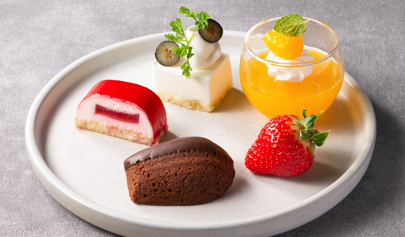 食後にはショコラマドレーヌやレアチーズケーキなど可愛らしい4種類のスイーツをワゴンにのせてお持ちいたします。