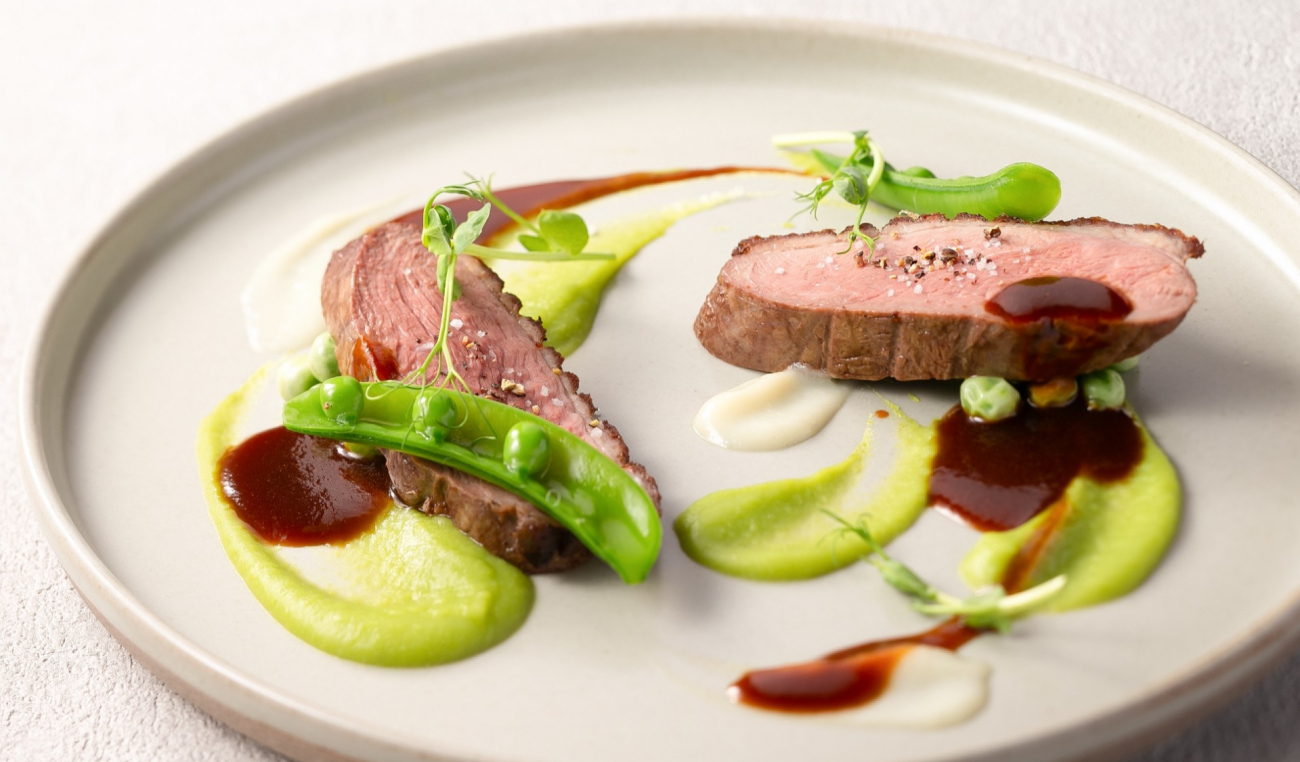 ・鴨胸肉のロースト プティポワのピューレとソースポワブラード