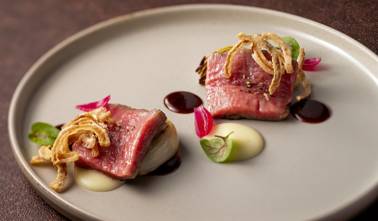 メインは甘い玉葱を様々な形で仕上げたガルニチュールを添えた博多和牛のフィレのロティ。
