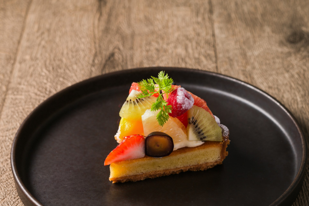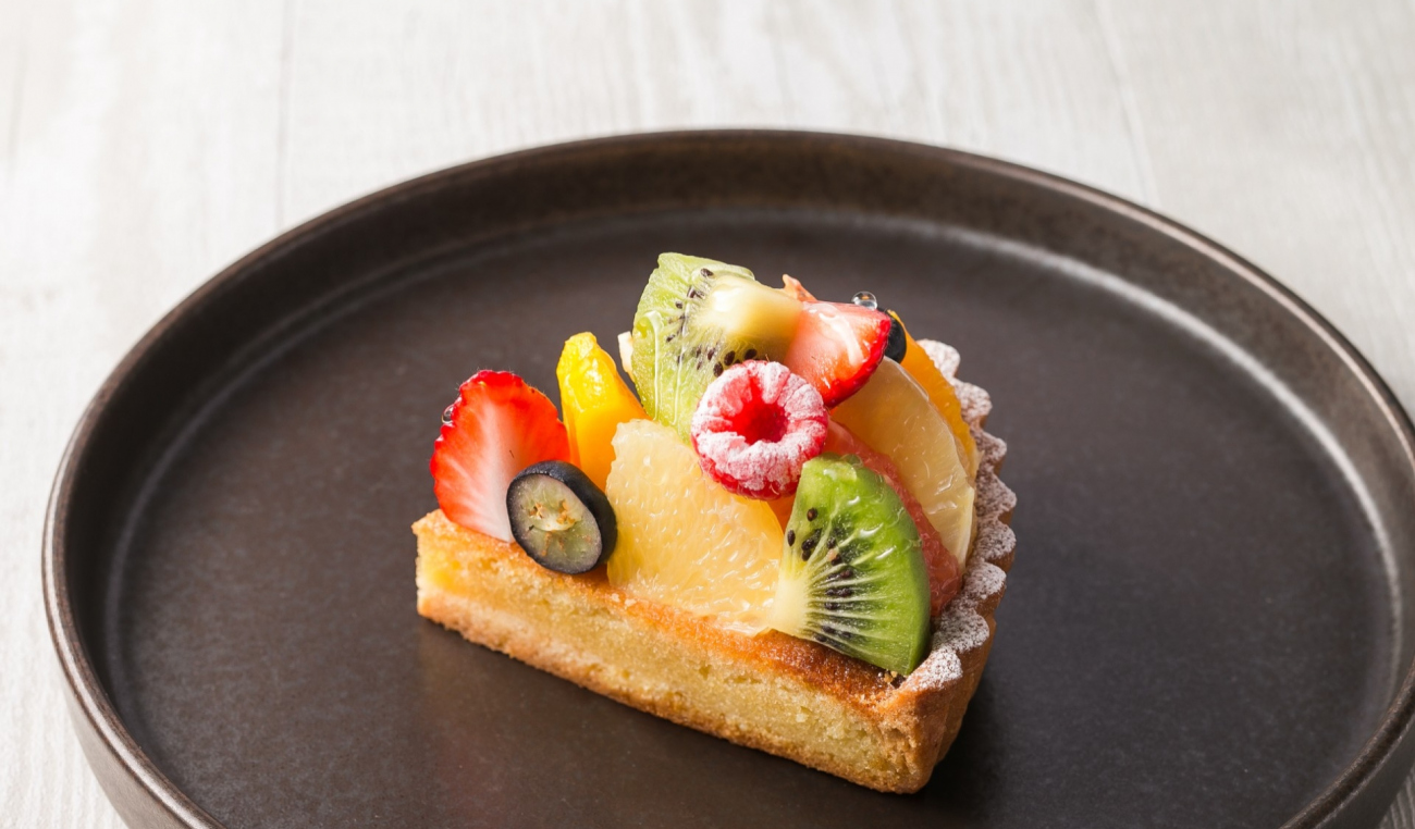 色とりどりのフルーツをたっぷりと飾った、見た目華やかなタルト。さくっと香ばしい生地とやさしい甘さのクリームが果実の甘酸っぱさを引き立てます。