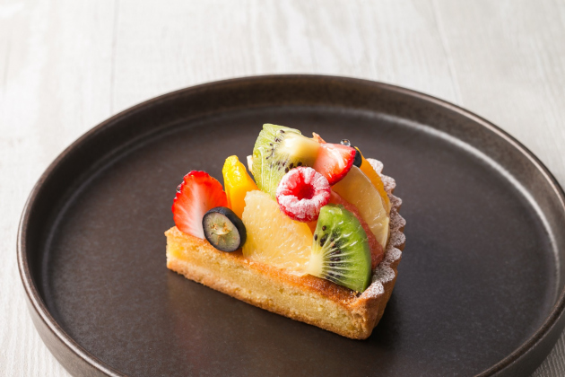 色とりどりのフルーツをたっぷりと飾った、見た目華やかなタルト。さくっと香ばしい生地とやさしい甘さのクリームが果実の甘酸っぱさを引き立てます。