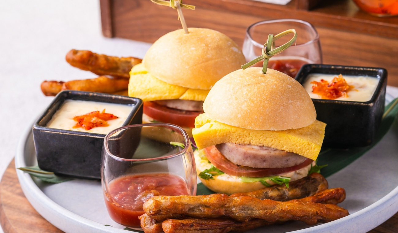 ■雲仙ハムと出汁巻き卵のブリオッシュバーガー:バターと卵をたっぷりと使用したブリオッシュに、ジューシーな雲仙ハムとだし巻き卵を挟みました。