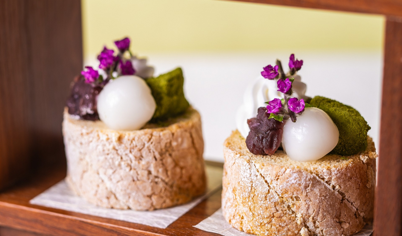 ◆黒糖とわらび餅のロールケーキ:黒糖の深い味わいが楽しめるロールケーキ。中にはわらび餅と白玉を詰め込んで、満足感ある一品に仕上げました。