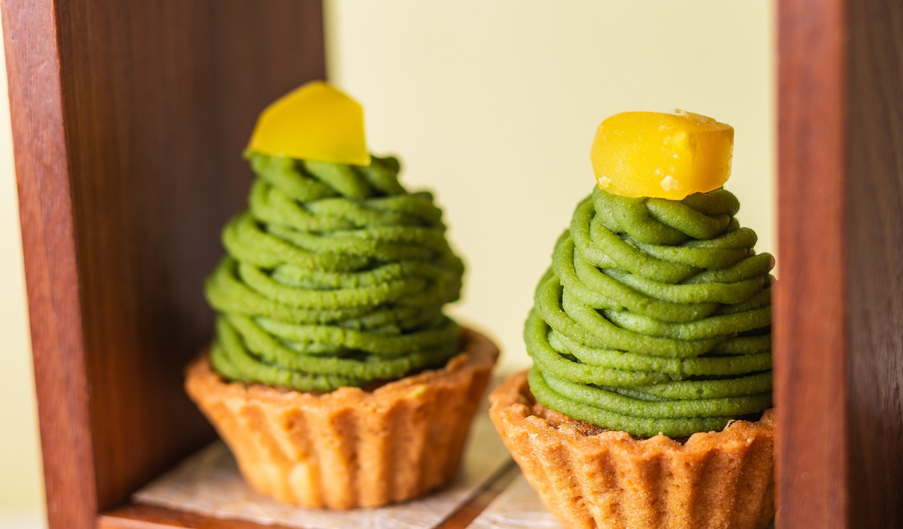 ◆八女茶タルト:八女茶の奥深い旨みとほのかな渋みを活かした抹茶タルトにしっとりとした栗の甘露煮を添えて。
