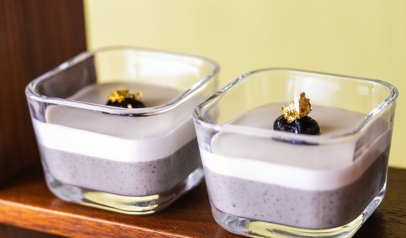 ◆黒ごまプリン:香ばしい黒ゴマのコクとなめらかな口どけ、深みのある味わいが広がる上品な和のデザート。