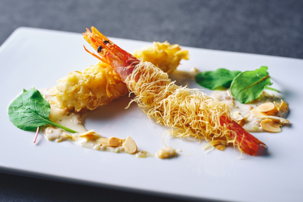 【お魚料理 +¥500】 アーモンドを纏わせた鯛とホタテのベニエと赤エビのカダイフ巻き
