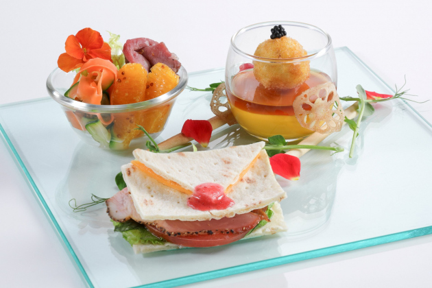 にんじんとズッキーニのリボンドレスサラダ オレンジ風味 ローストビーフを添えて / かぼちゃのムース 生ハムコロッケ添え 馬車仕立て / 舞踏会への招待状 ~ポークパストラミのサンドウィッチ~