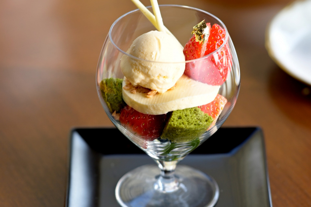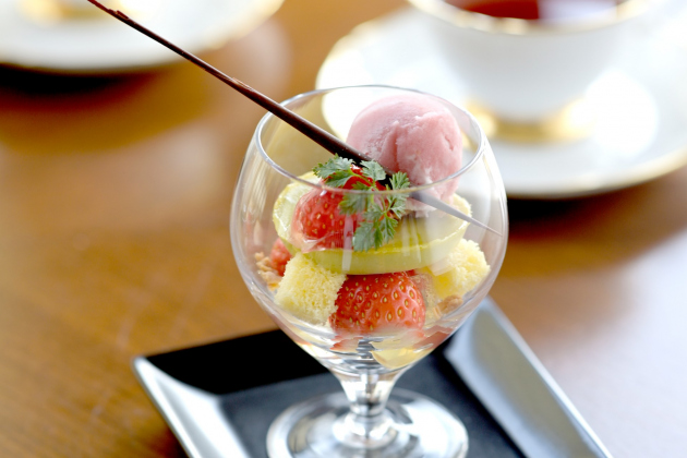 志摩産レッドパールイチゴのシャーベットにカモミールジュレ、ピスタチオのクレームブリュレを合わせたグラスパフェは春の装い。4月16日からは伊勢茶スイーツを盛り込んだパフェへ装いを一新します。