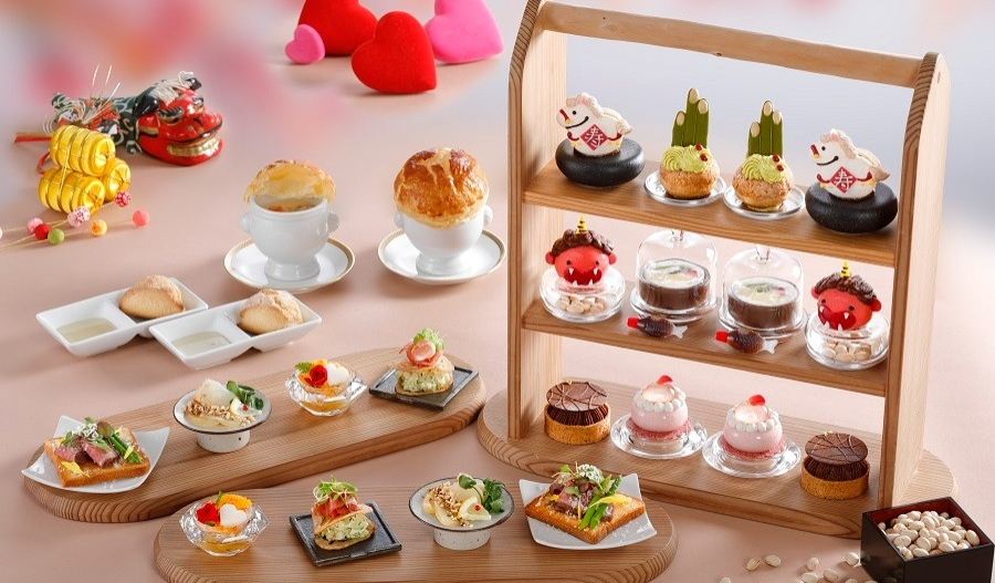 正月からバレンタインデーにかけて、冬のイベントを一度に楽しめるアフタヌーンティーをご用意しました。スタンド上段は「新春」をテーマに2026年の干支「丙午」と門松をモチーフにしたスイーツを、中段は「節分」をテーマに赤鬼と恵方巻に見立てたスイーツを、下段は「バレンタイン」をテーマに、ショコラタルトと淡いピンク色のスイーツを盛り付けました。また、クラムチャウダーのパイ包み焼きなど、冬にぴったりなセイボリーもご用意していますので、スイーツとともにお楽しみいただけます。