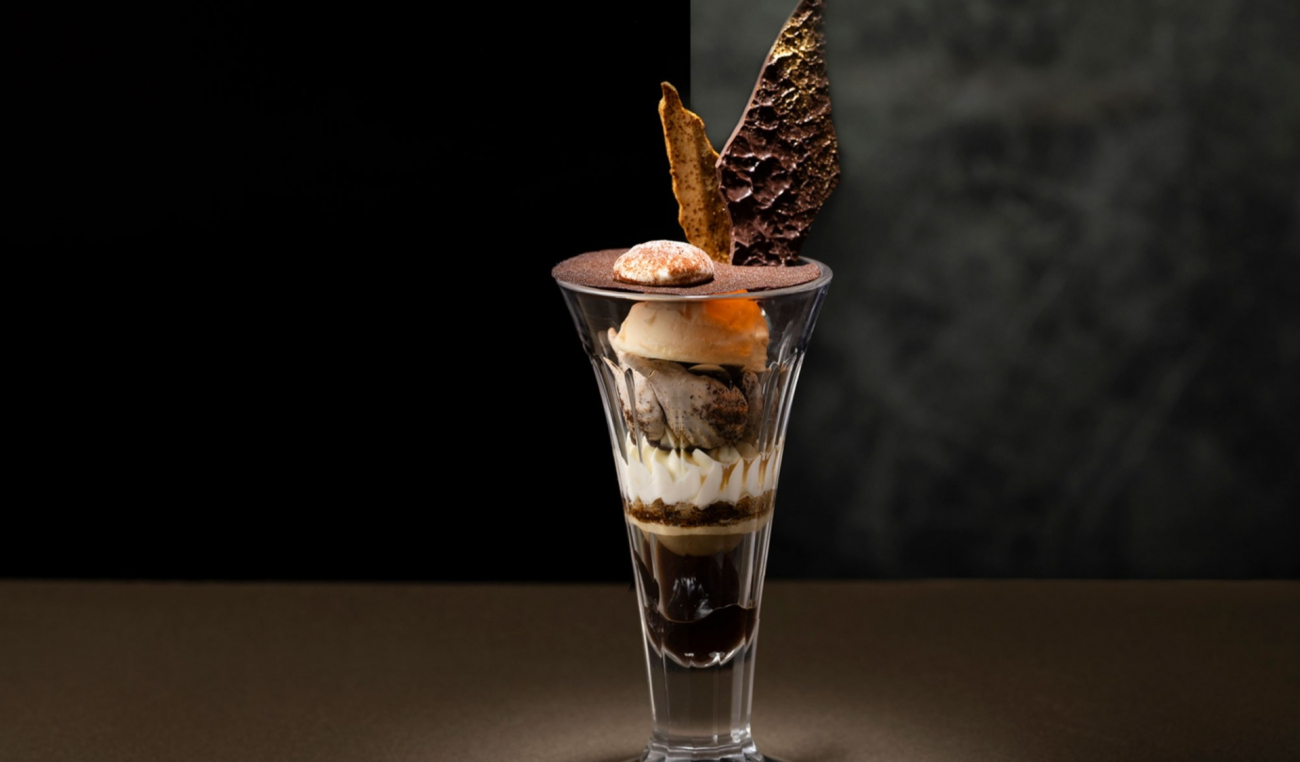 マスカルポーネのアイスやコーヒーゼリー、メレンゲなど食感の違いもたのしめえる、ブランデーをきかせたパフェです。