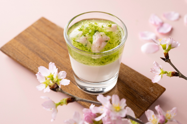 桜の葉のゼリーの瑞々しい緑に花びらを浮かべた、口当たりなめらかでさっぱりと楽しめる桜のパンナコッタです。
