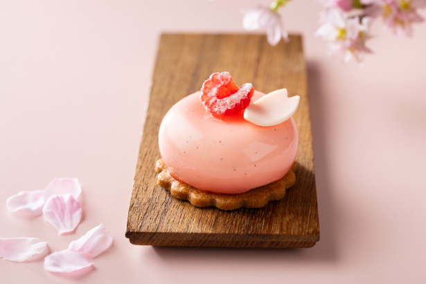 ベリージャムを忍ばせたタルトに、レアチーズと桜餡を重ねた一品。桜餡のシャンティや白玉、イチゴ、ほどよい塩味の桜で春の余韻を添えます。