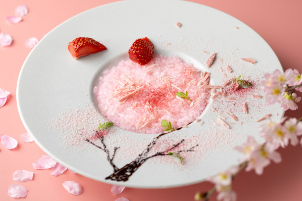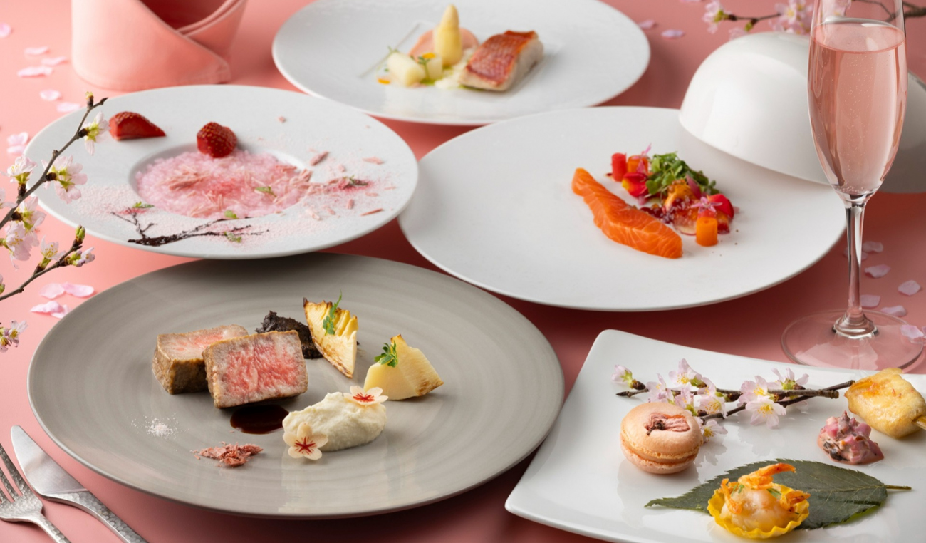 桜色のテーブルクロスやナフキンで彩った店内にて、桜スカッシュ、ロゼスパークリングワインなど、春を感じるドリンクもあわせてお楽しみいただけます。桜をモチーフにした料理とともに、春ならではの味わいをご堪能ください。