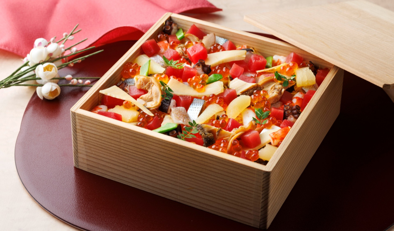 桃の節句やお祝いの席を華やかに彩るちらし寿司。天然本鮪をはじめ、鮑や車海老、いくらなどの具材を贅沢に盛り込み、折箱に詰めてご用意いたします。