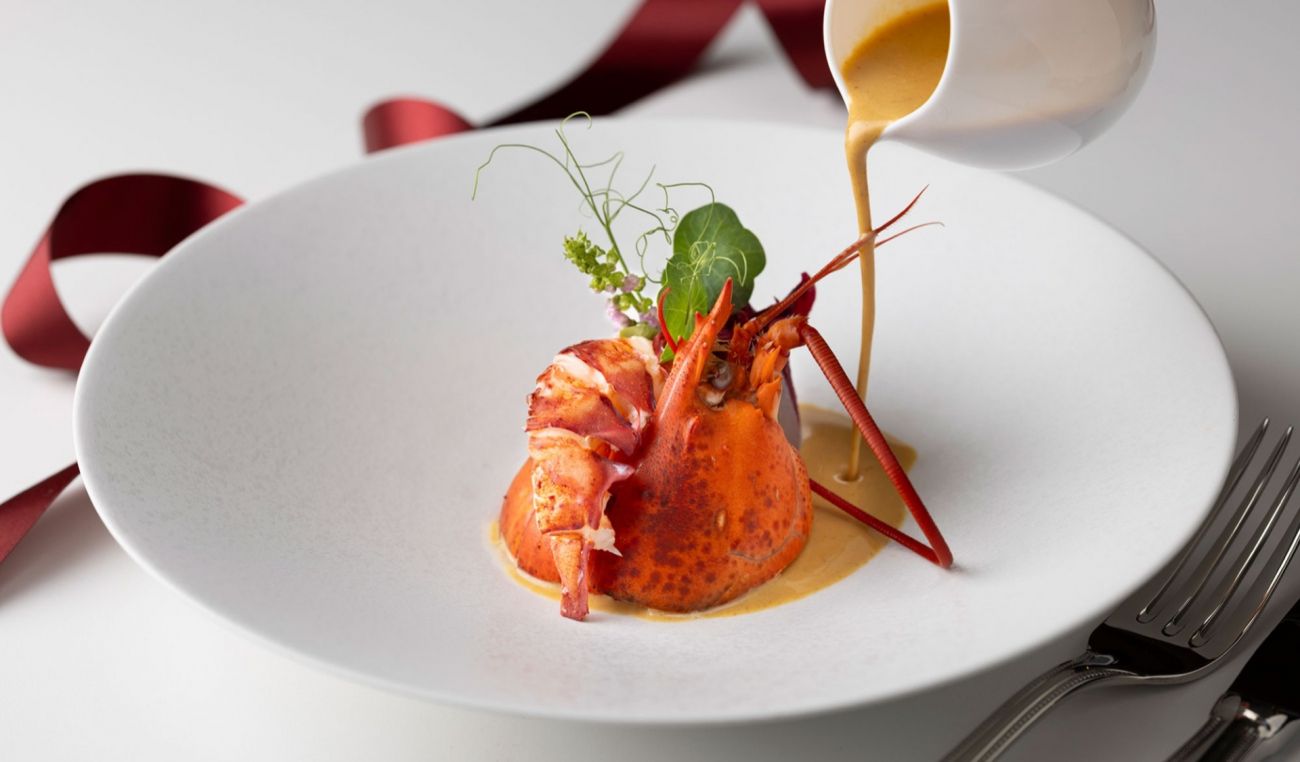 クリスマス期間限定の鉄板焼コースをご用意しました。前菜は、活けオマール海老に爽やかなカレー風味のソースを合わせたナージュ仕立ての一品です。