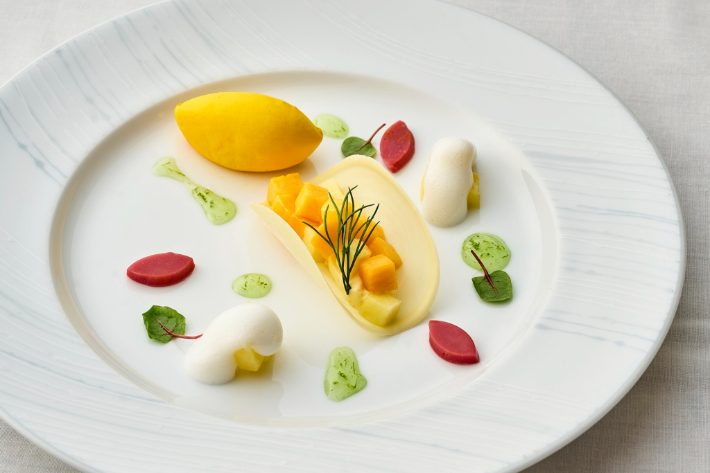 - マンゴーとパイナップルロティー コリアンダー風味のムースリーヌ