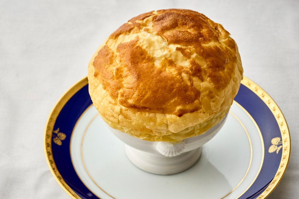 フォアグラのポワレ ソースエーグルドゥースと共に - タピオカと彩り野菜を詰めたコンソメスープ パイ包み焼き