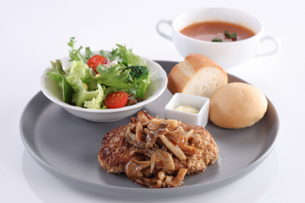 豆腐と鶏肉のヘルシーなハンバーグを旨味たっぷりの茸ソースでお召し上がりください